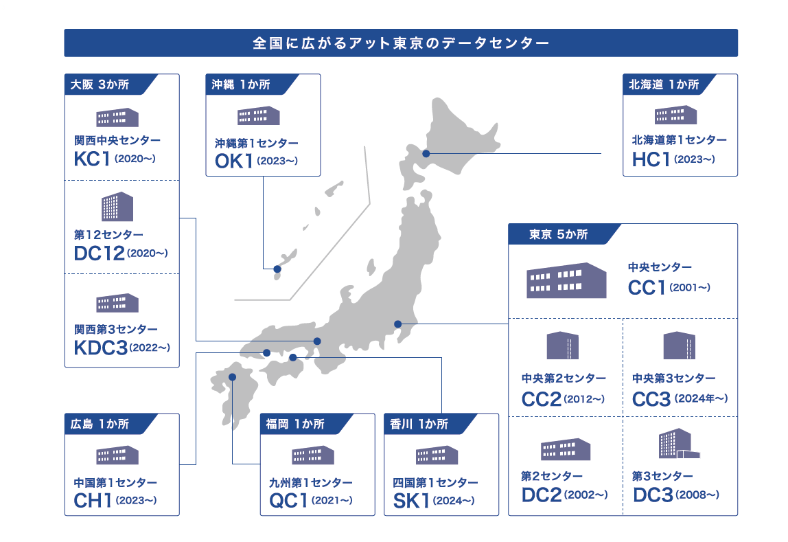 日本のビジネスの中心地である東京、大阪、福岡をはじめ、各地にデータセンターを設置し、BCP(事業継続)や、クラウド活用の際のネットワーク冗長化に対するデータセンターの連携ニーズにお応えします。